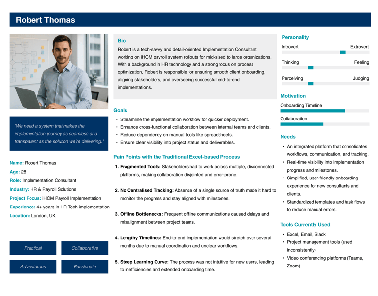 I developed a user persona representing the Implementation Consultant (IC) to humanise the target user and better visualise their behaviours, goals, and motivations. This persona was informed by insights gathered during user research interviews, ensuring it accurately reflected real user needs and pain points.